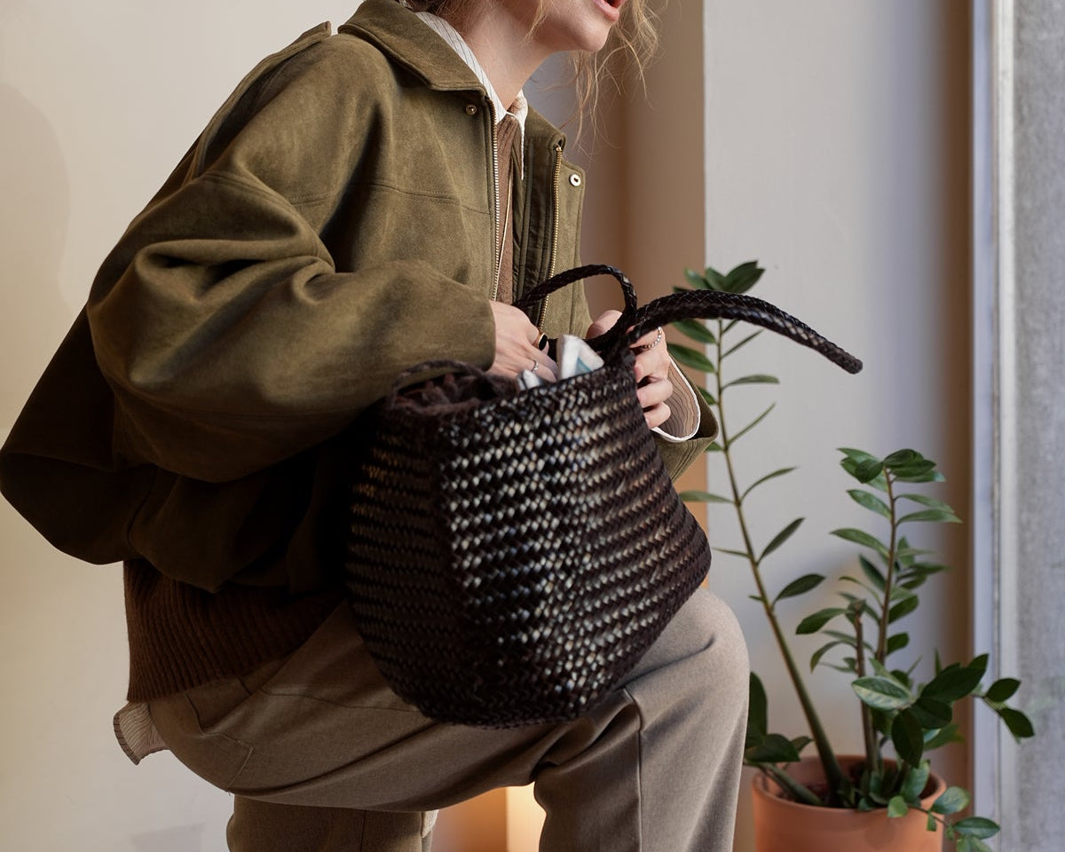 Each bag has been handwoven by an expert artisan in our factory in Chennai, India. They are unique pieces, different from each other, and with a unique beauty designed to be worn for a lifetime.